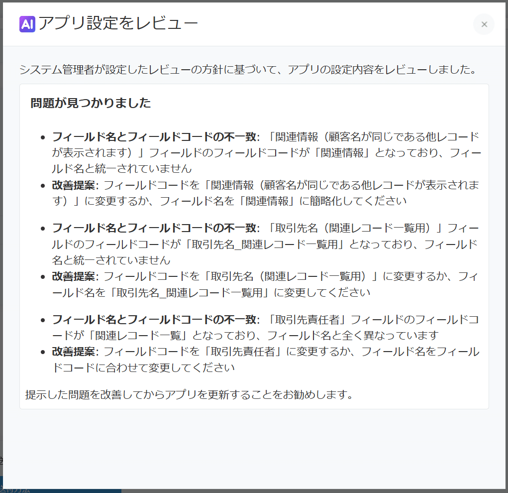アプリ作成者が設定したアクセス権やフィールド設定に対して、管理者が事前登録した基準と照らし合わせ、AIがレビューしてくれる機能です。