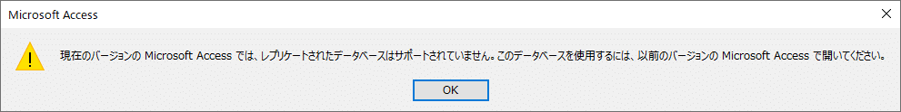 「現在のバージョンの Microsoft Access では、レプリケートされたデータベースはサポートされていません。このデータベースを使用するには、以前のバージョンの Microsoft Access で開いてください」